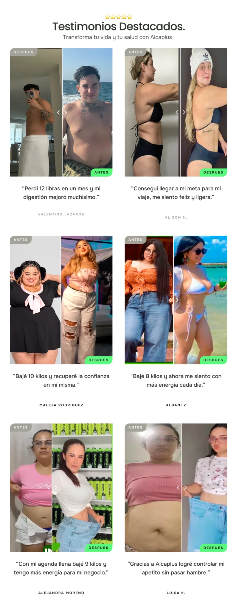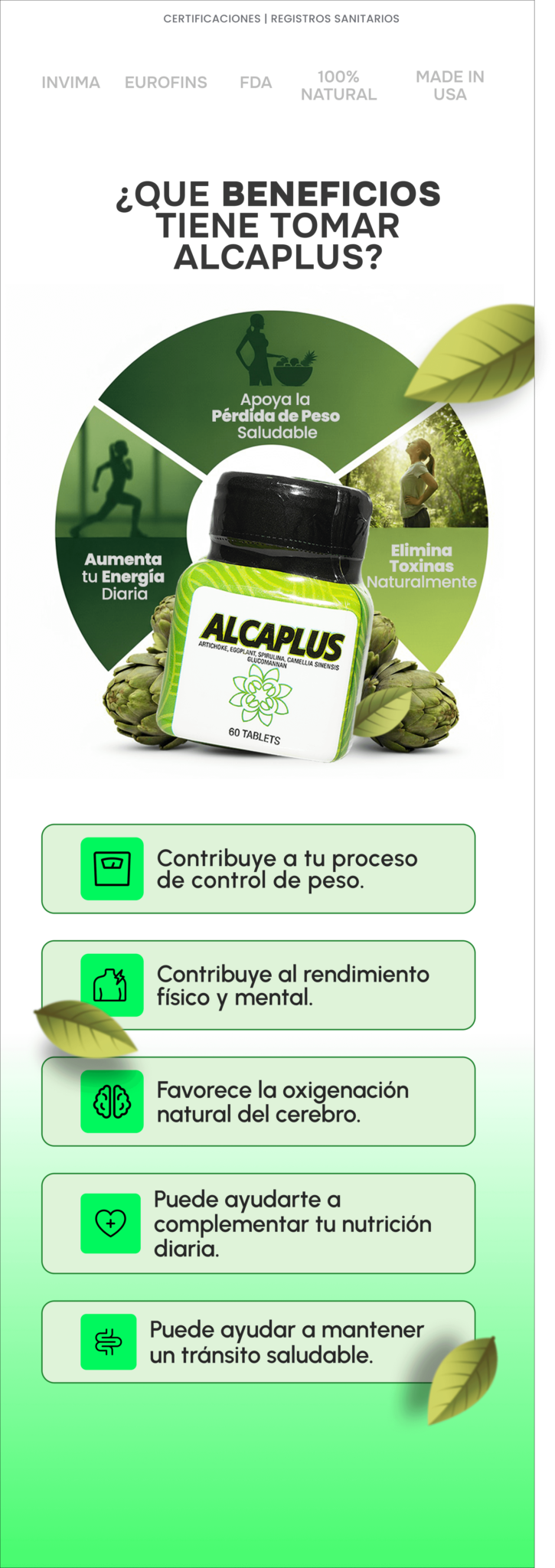 Alcaplus es un alimento 100% natural diseñado para apoyar tu proceso de pérdida de peso de forma saludable y sostenible. Cada componente ha sido cuidadosamente seleccionado y cuenta con estudios clínicamente comprobados que respaldan su eficacia.